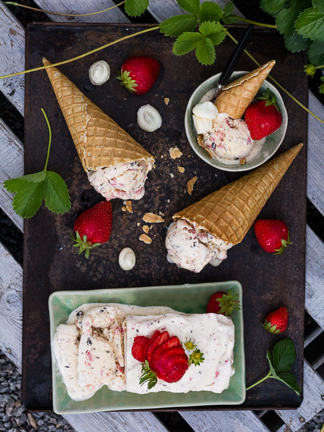 Jordgubbsglass i stora lass, i strut och på fat.