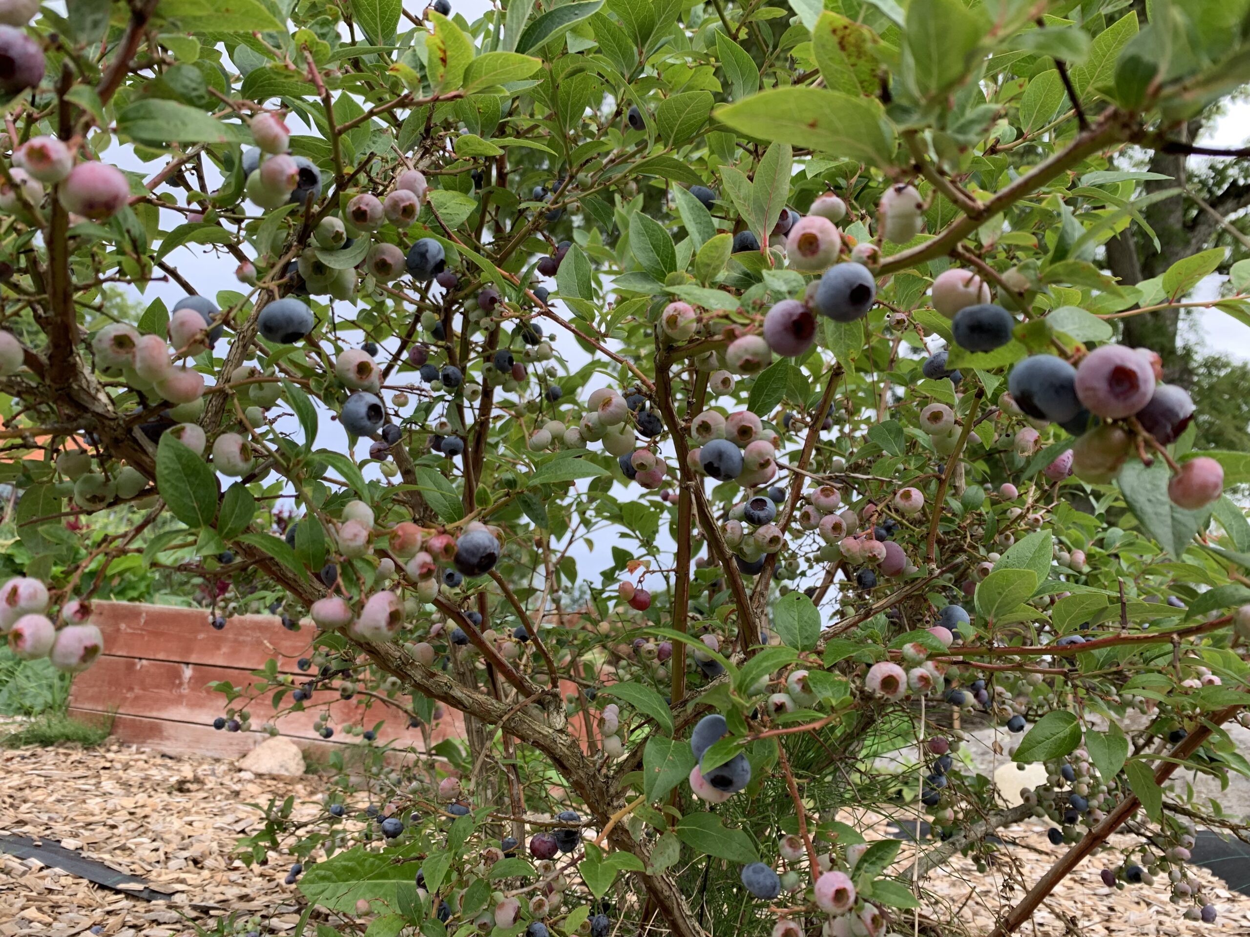 På friland har jag stor glädje av olika sorters blåbär som jag kunnat skörda massor av i flera veckor.