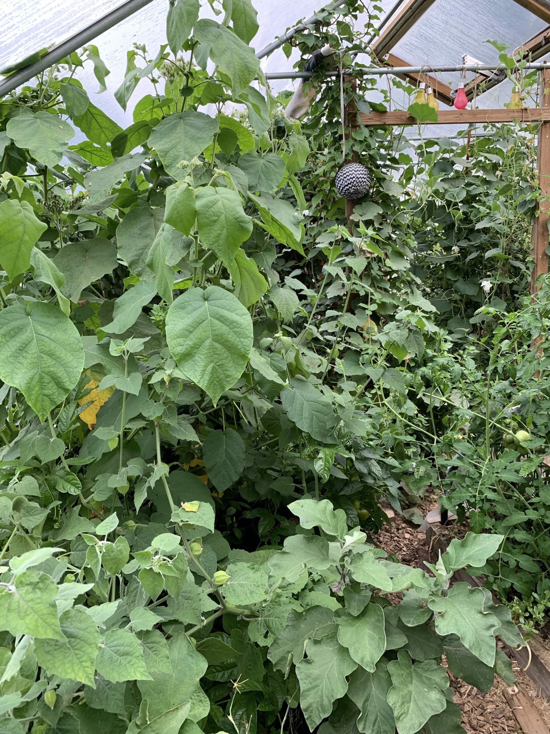De tre enorma växterna närmast i bild är mini-tamarillo som vuxit oerhört bra. Vet dock inte om de hinner ge någon skörd.