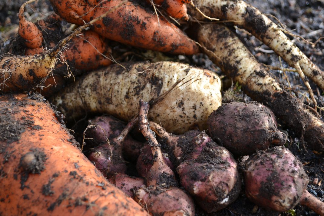 Blandade rotsaker i beige, lila och orange ligger jordiga i en samling.