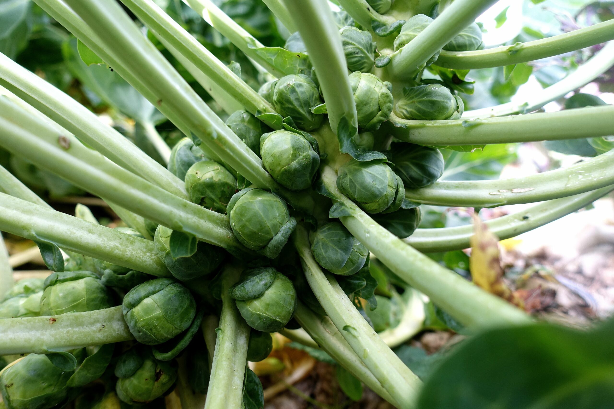 En sned stam av brysselkål som ligger över landet.