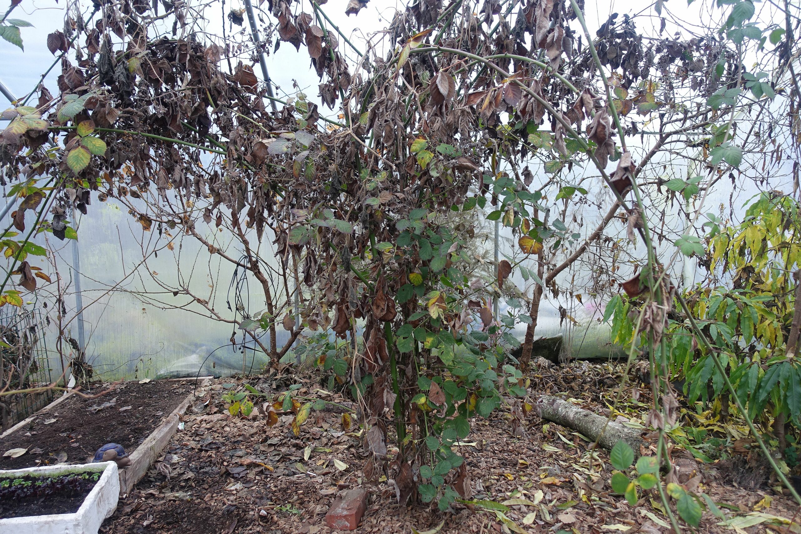 Så här såg björnbärsbusken ut innan beskärningen. En riktig rishög med ihoptorkade blad och massor av sidoskott i flera meters långa vindor.