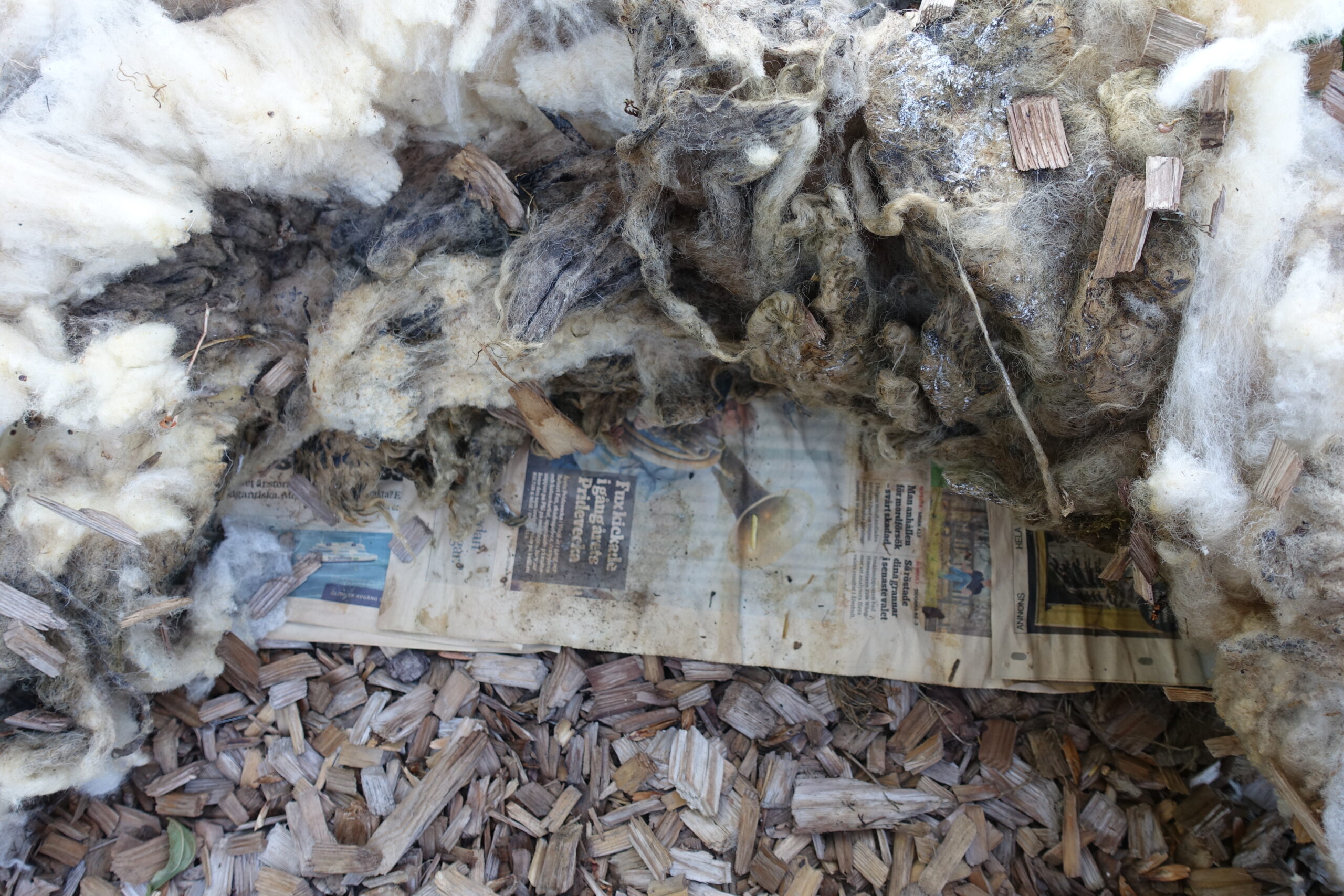 Här har jag lyft undan en bit av ullen för att visa tidningen under.