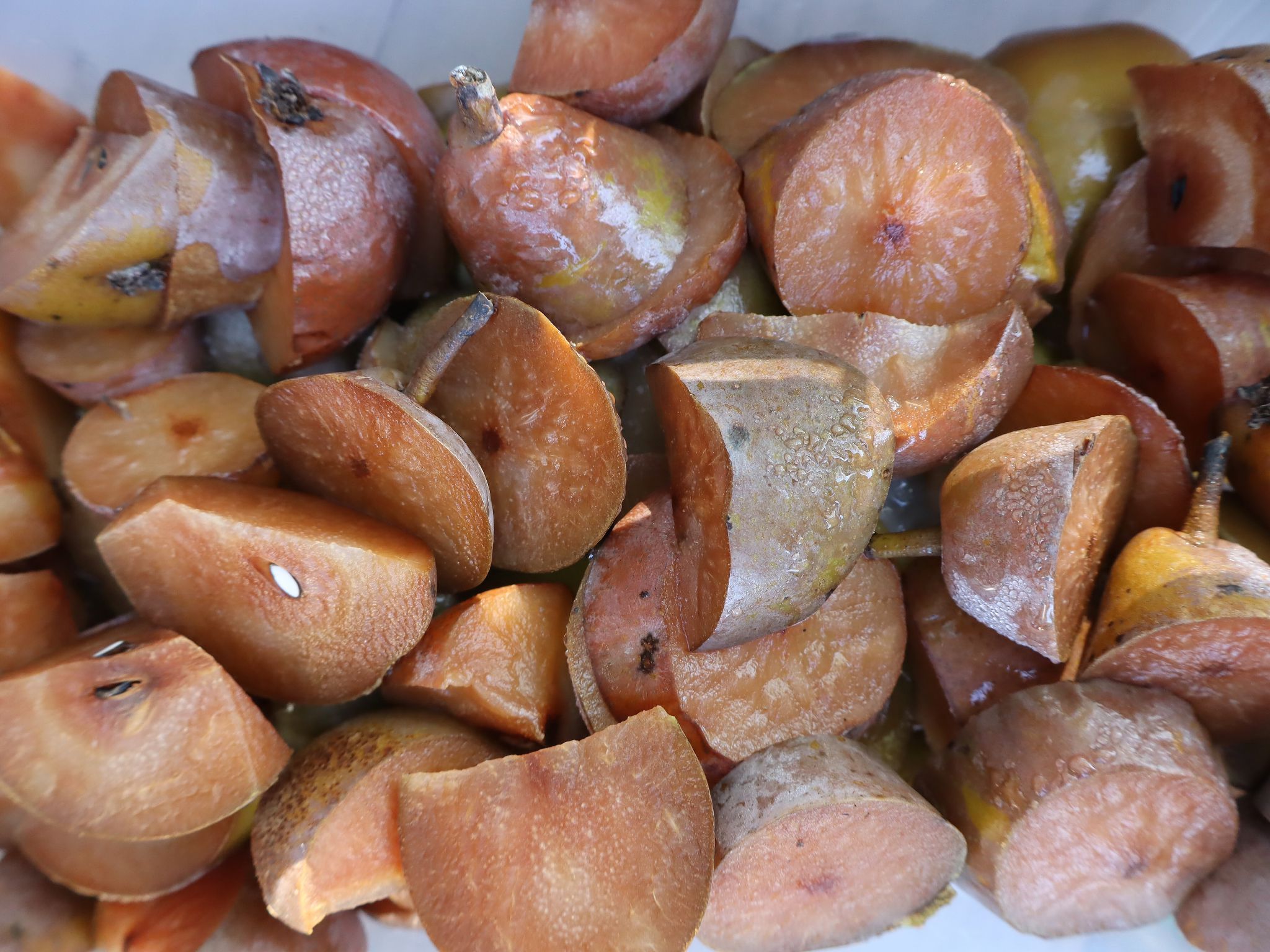 Frysta äpplen ser inte aptitliga ut när de tinat. Dessa är enbart till must. När jag fryser äpple till kräm gör jag annorlunda, då behåller de färgen bättre.