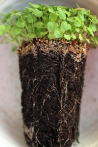 De små skotten kräver egentligen bara pyttelite jord, men odlas här i en större plugg som en del i Skillnadens krydd-kalender hösten 2025.