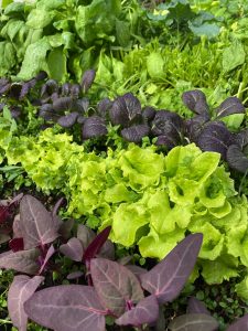 Raden längst bak (gröna blad) är spenat, som redan skördats genom att bladmassa klippts av. Bladen kan skördas ett och ett eller klippas.