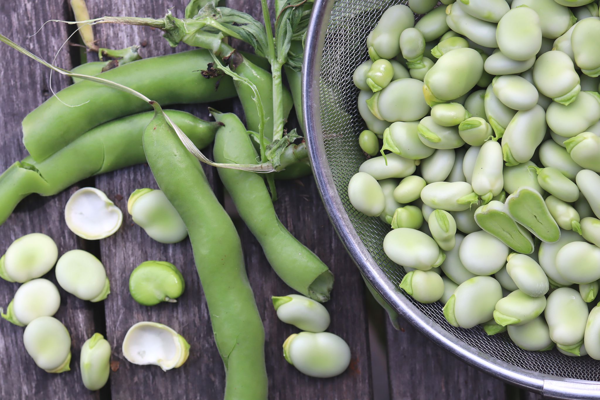 Färska bondbönor tillagas innan de äts. Först pillas bönorna ut ur bönskidan.