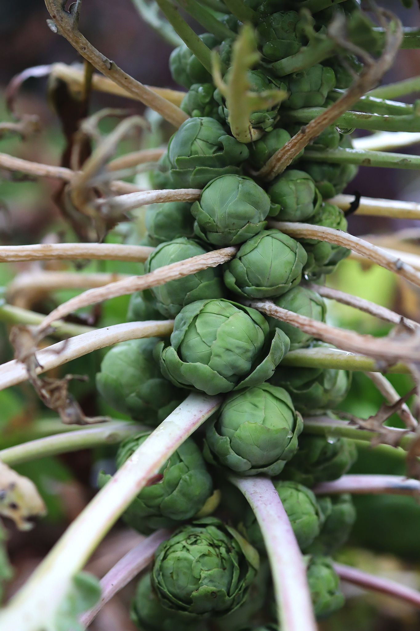 En välvuxen kålstock fullproppad med brysselkål - en läcker råvara på hösten.
