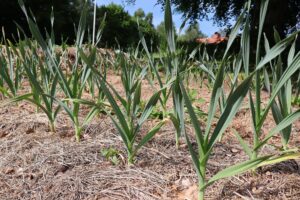 I vår odling på Skillnadens handelsträdgård växer elefantvitlök i upphöjda bäddar som täckodlas med ensilage. Jorden är lucker och växterna utvecklas riktigt fint.