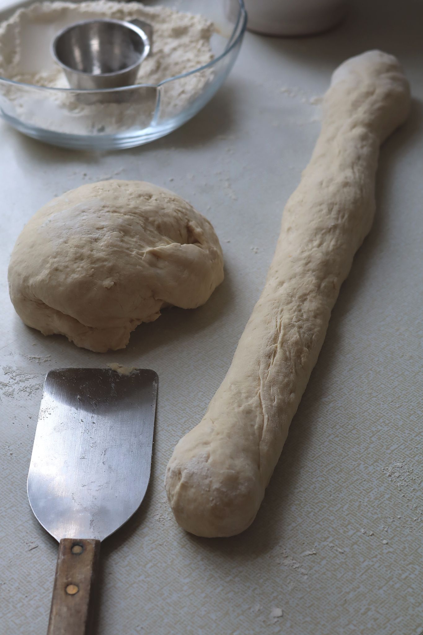 En "korv" av deg delas i bitar och ställs på en plåt med bakplåtspapper att jäsa.