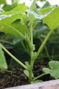 I tunnelväxthuset börjar små knoppar och fruktämnen titta fram på plantor som såddes i juni. När dessa börjar ge tar jag bort äldre plantor som börjar se medtagna ut och kanske inte längre ger så god skörd.