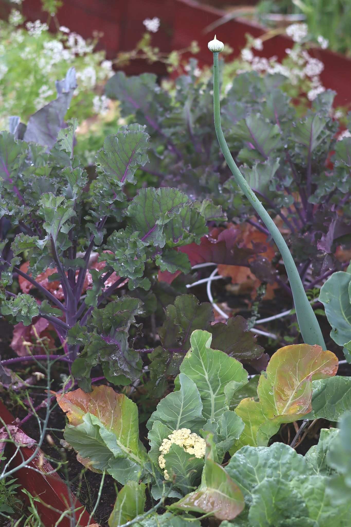 Nu tar jag bort plantor som är utom räddning och gödslar massor till övriga. Den höga purpurfärgade kålen är en blomsterkål. Den växer likt brysselkål, fast med öppna rosetter längs stammen istället för små knutna huvuden.