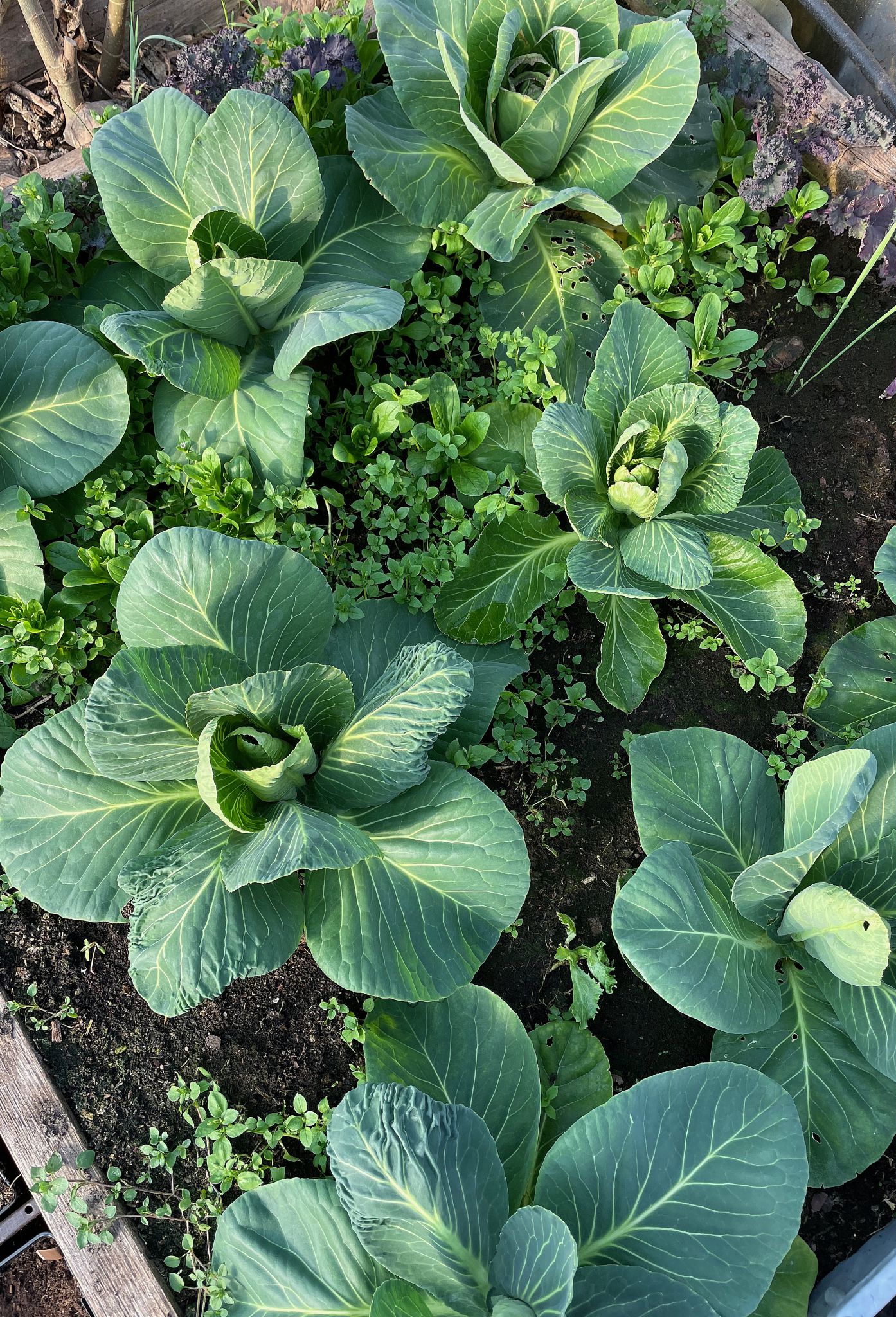 19. April 2021Det är totalt åtta kålplantor, de växer i ett hörn i en bädd i mitt stora tunnelväxthus.