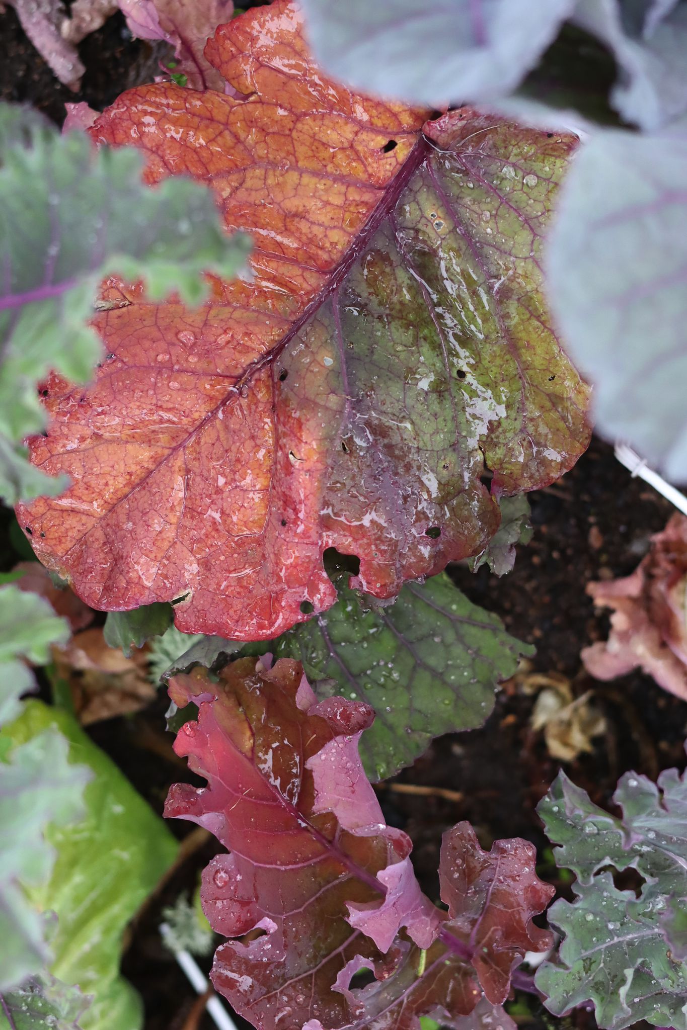 På rödbladiga kålsorter syns missfärgningar på bladen också tydligt, genom att de blir mer gula och bleka. Sedan trillar de av.