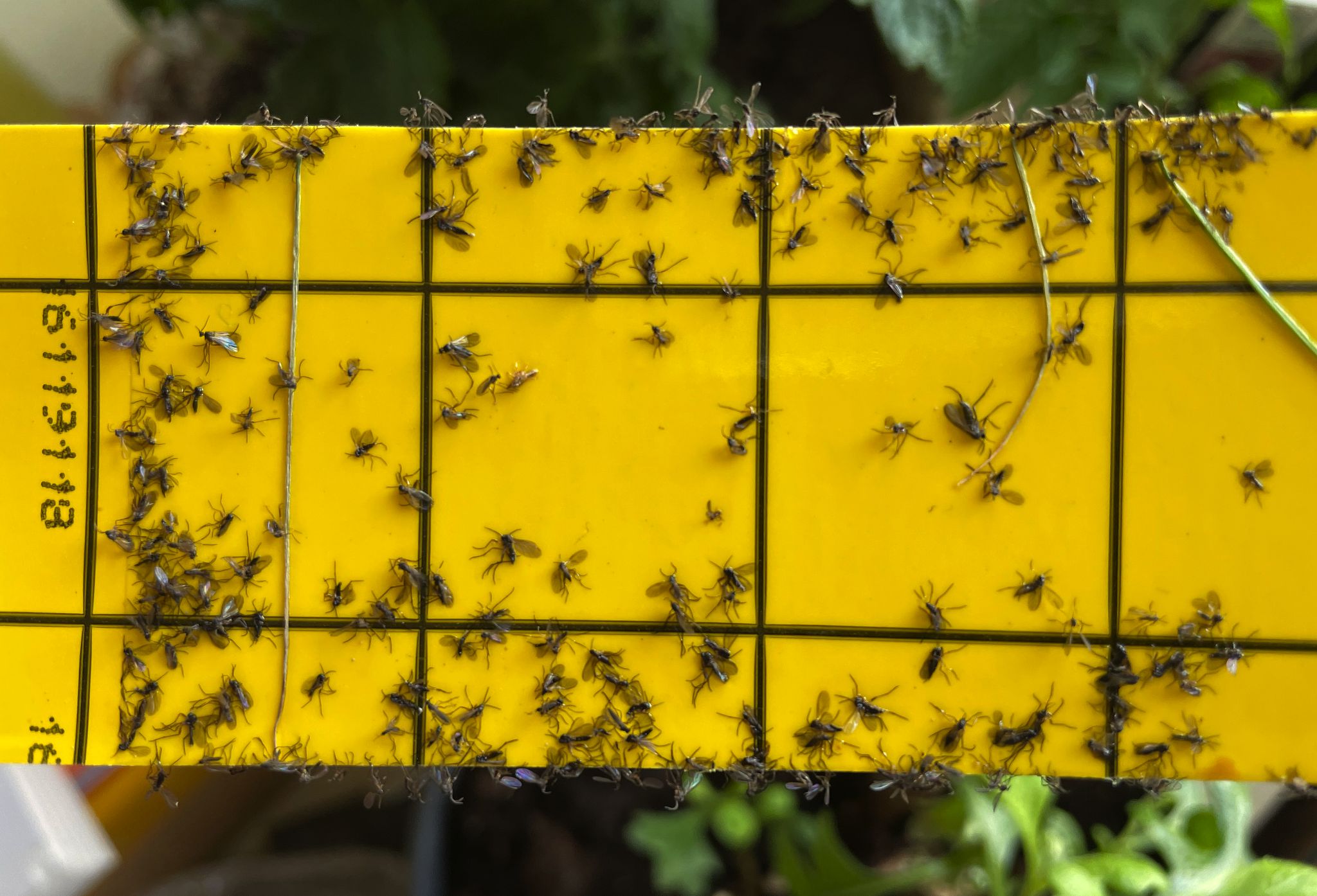 Runtom i mina planteringar har jag gula klisterskivor som fångar sorgmyggor. De är så väldigt många!