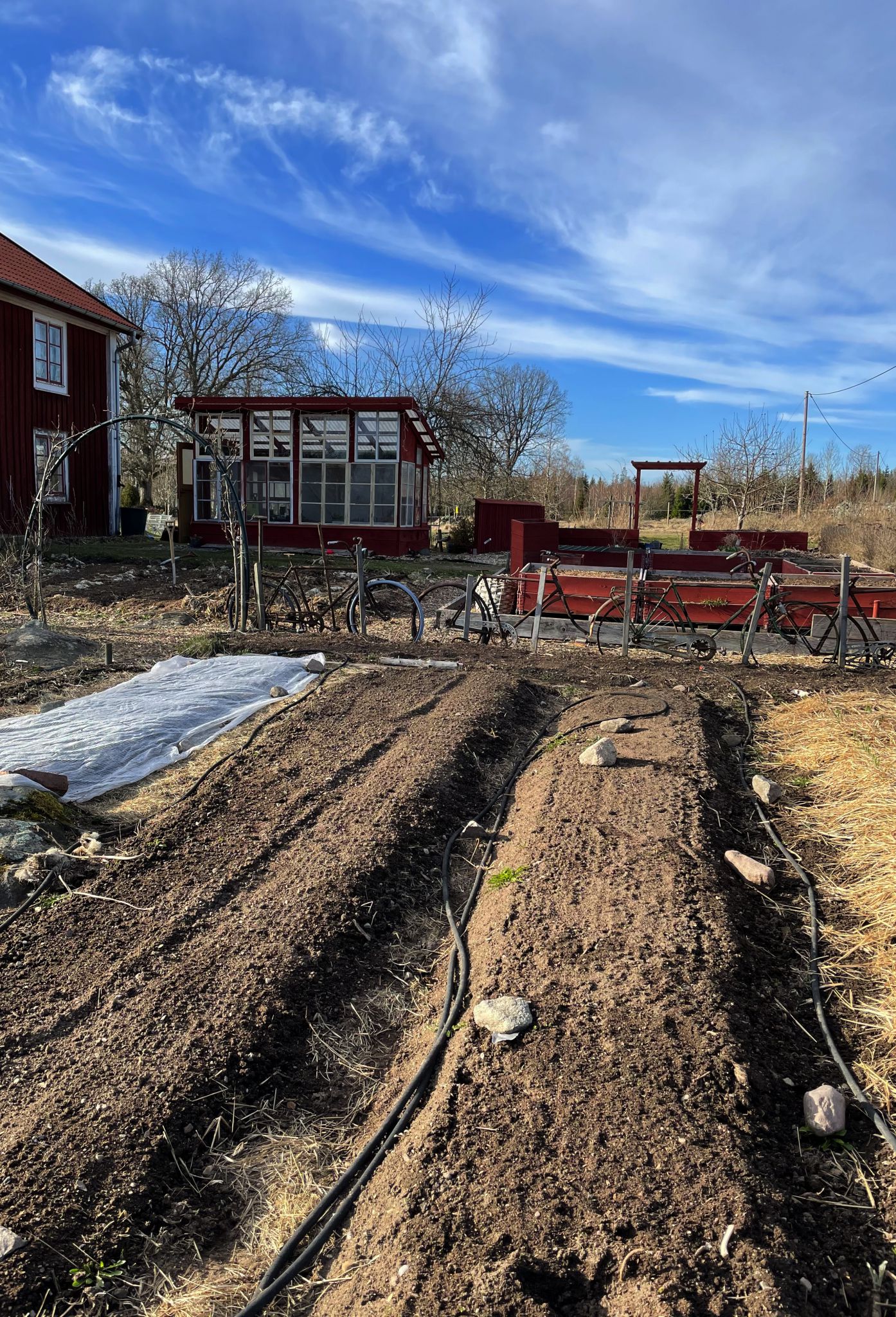 I de här landen växer spenat under fiberduk till vänster och i näst vänstra bädden är potatislök satt. Jag har ännu inte vattnat dessa land, jorden hålls fuktig genom några spridda regnskurar de senaste dagarna.