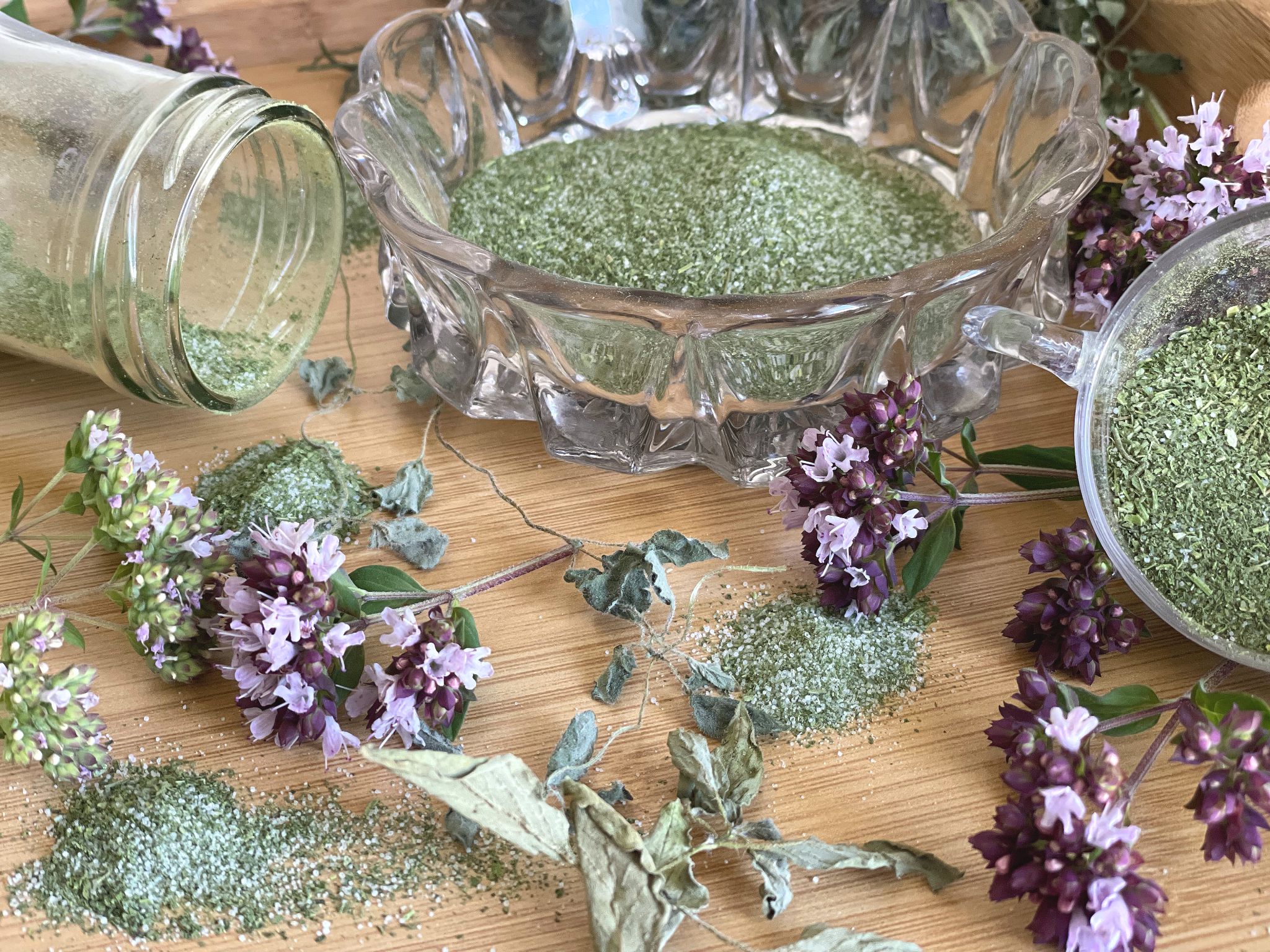 Hemgjort örtsalt kan bestå av örter och grönsaker som finns i trädgården. Mitt salt innehåller mycket oregano.