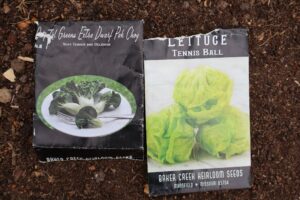 I dessa backar sår jag två grönsaker som passar perfekt till sådd i kylig jord; sallat och pak choy. Bägge sorterna är från en utländsk fröfirma och finns inte att köpa i Sverige. Det är heller inte längre tillåtet att köpa frö från länder utanför EU, utan krångliga certifikat.