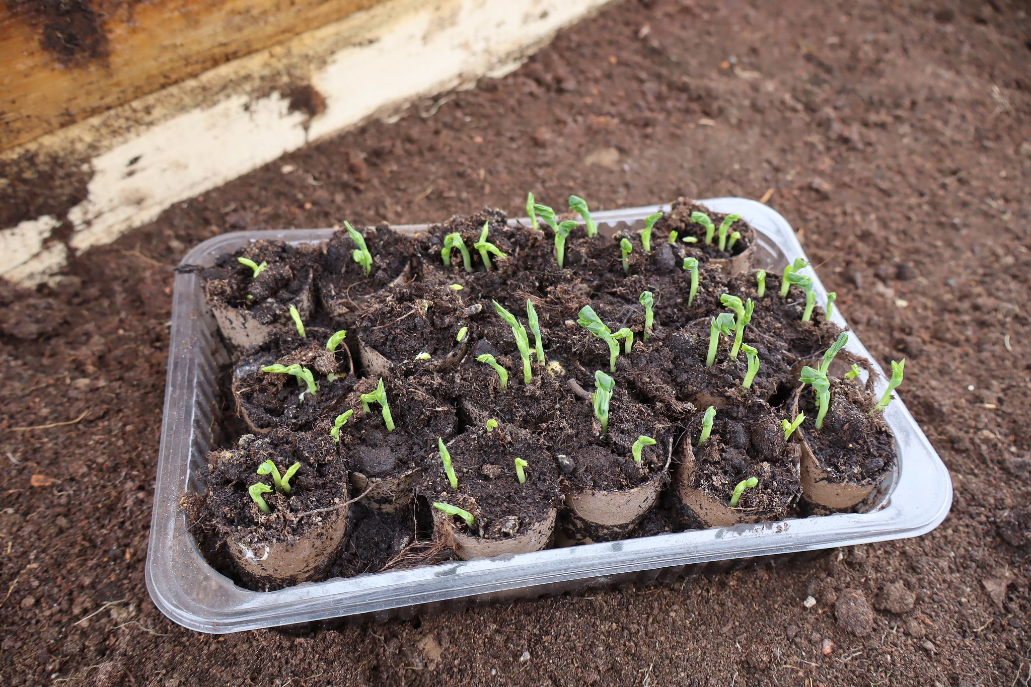 Mitt tråg med sockerärter 'Norli' är klart att lyftas ut i växthuset och planteras. Sådd 4 februari inomhus, utplanterad 13 februari i tunnelväxthus.