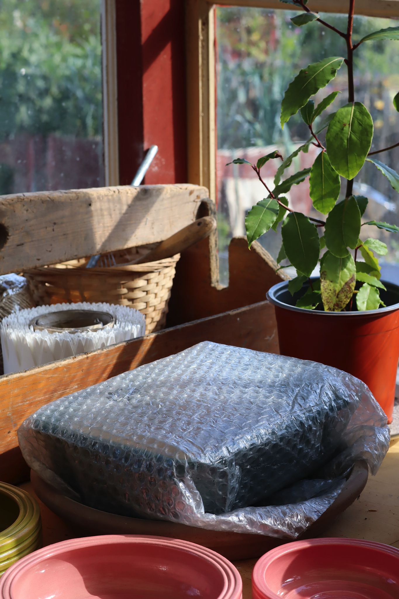 16. September 2025Den färdiga sådden har täckts med bubbelplast och står i på en bänk i växthuset nu.