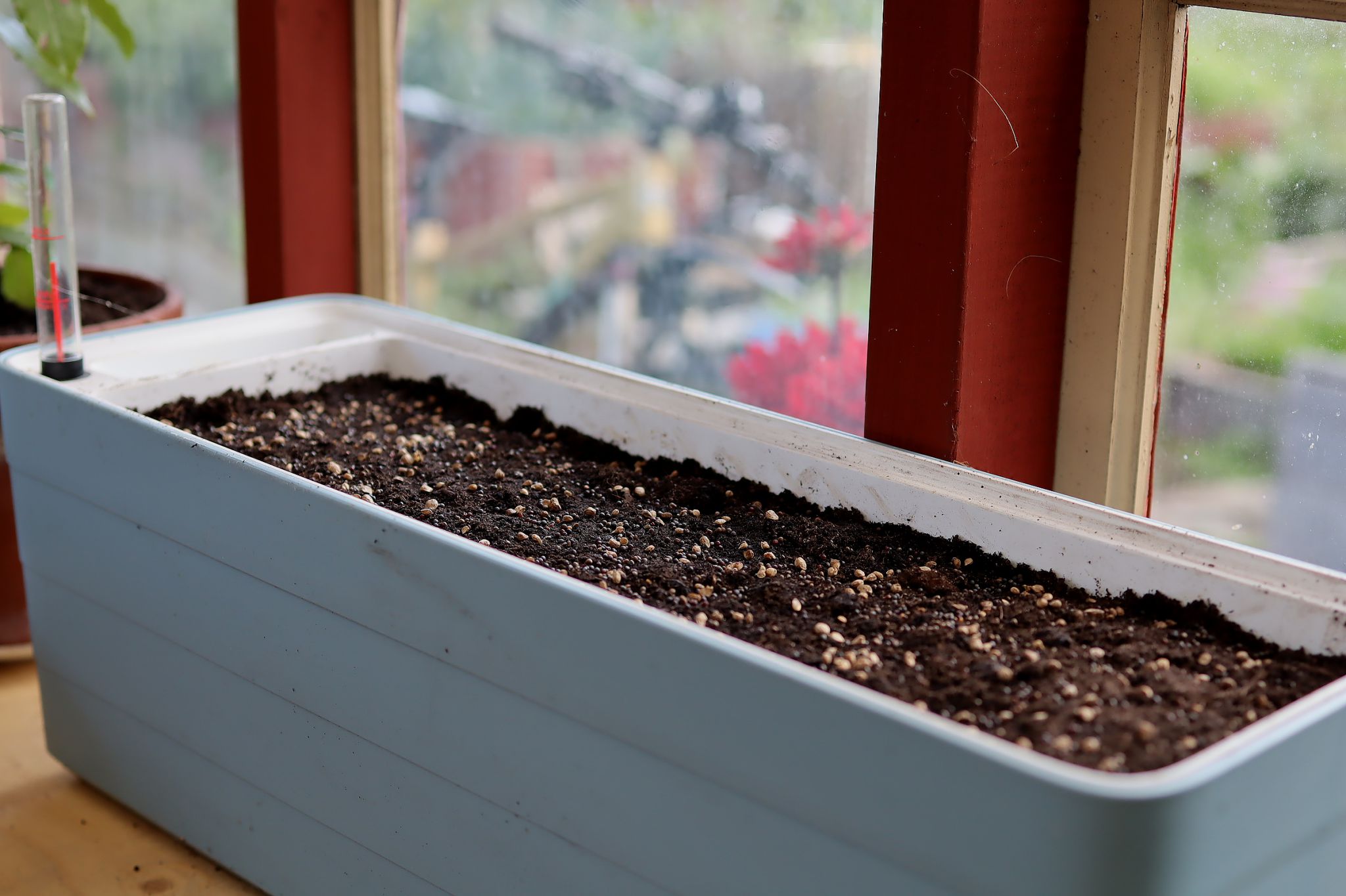 Min självbevattnande kruka/tråg såddes den 23 sepbember. Tråget är av en modell som heter Berberis. Väldigt bra! Finns både stora och små.
