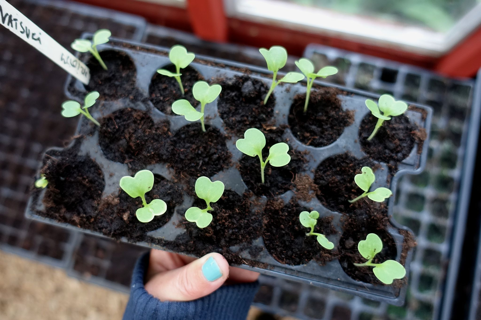 Eftersom mycket yta fortfarande står med växter kvar, är det en god idé att så några favoriter i pluggbrätten, tråg och krukor. Dessa kan sättas ut när det blivit plats ledig. Här är salladskål. Den ska få bli lite större innan den sätts ut på en skyddad plats.