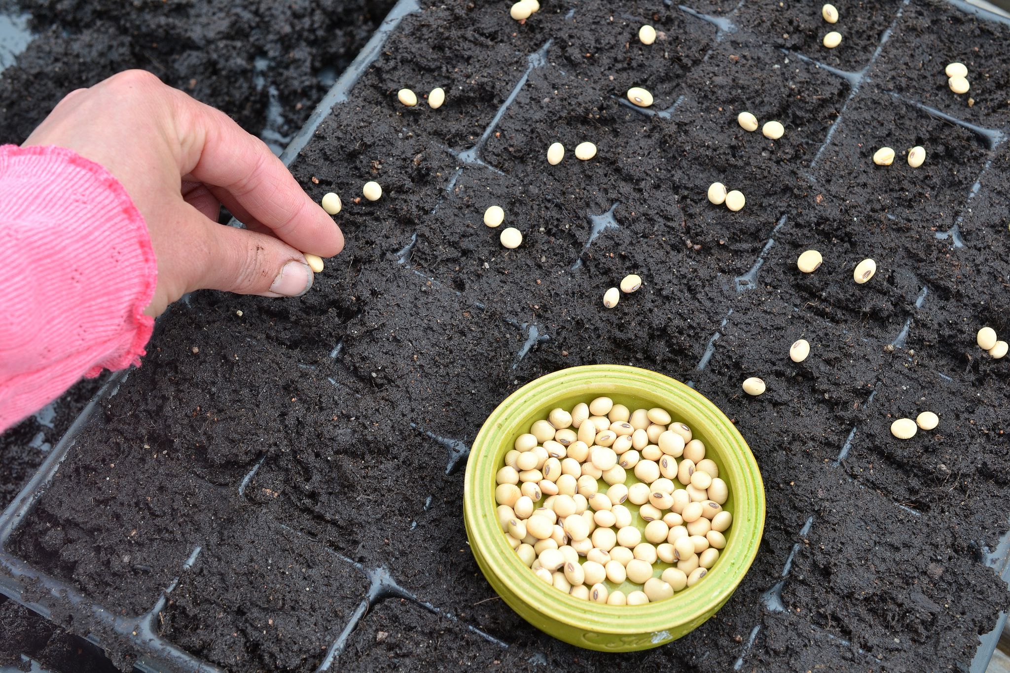 Varje plugg sås med två bönor. Om bägge gror sätts de ut som en enda planta. Om något går fel och bara en gror, blir det ändå något från den pluggen.