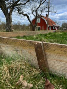 På utsidan av ramen slogs två stöttor per sida ner i jorden och spikades sedan fast i ramen.