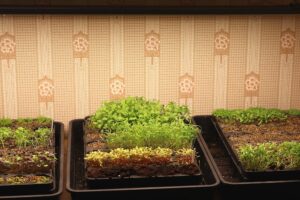 De tre trågen står bredvid varandra under växtbelysning inomhus. Den här växtbelysningen är ganska stark och kan vara längre ifrån växterna. Den belyser därmed ett större område.