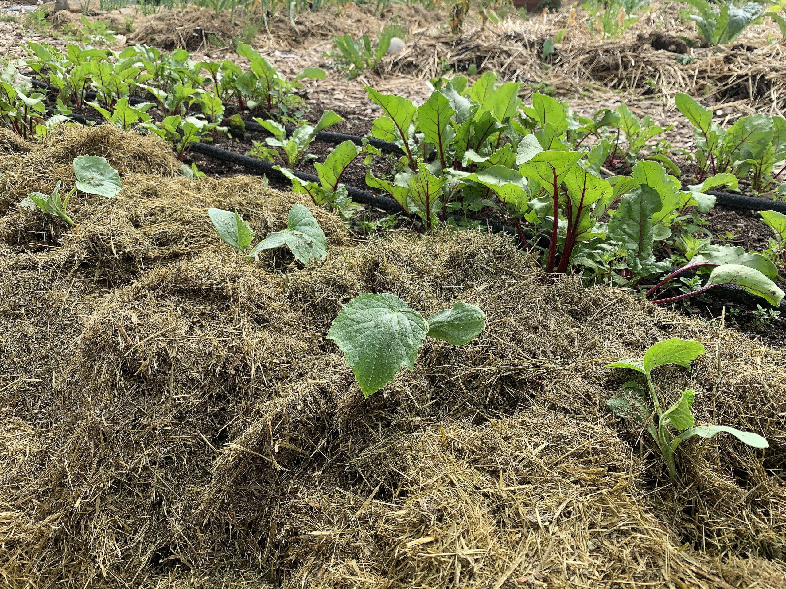 Gurkorna är nu inbäddade i ett fint lager gräsklipp som håller fukten fint i jorden och skyddar den från att torka ut varma dagar.