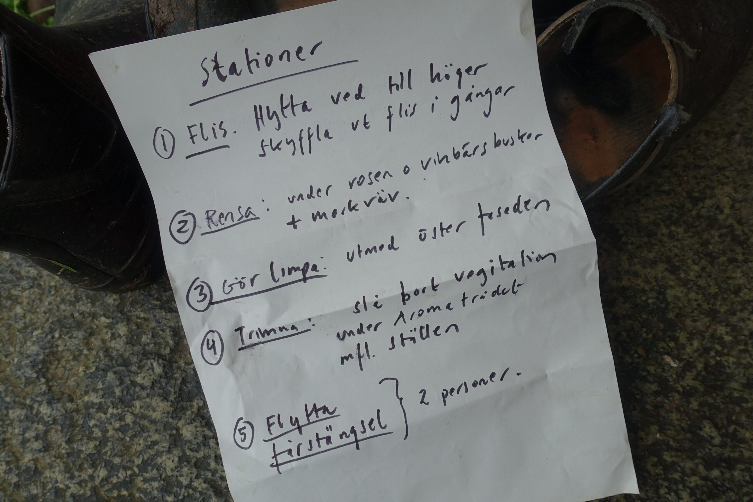 13. July 2019Katinkas att-göra-lapp till vår gemensamma jobbarstund i hennes trädgård.