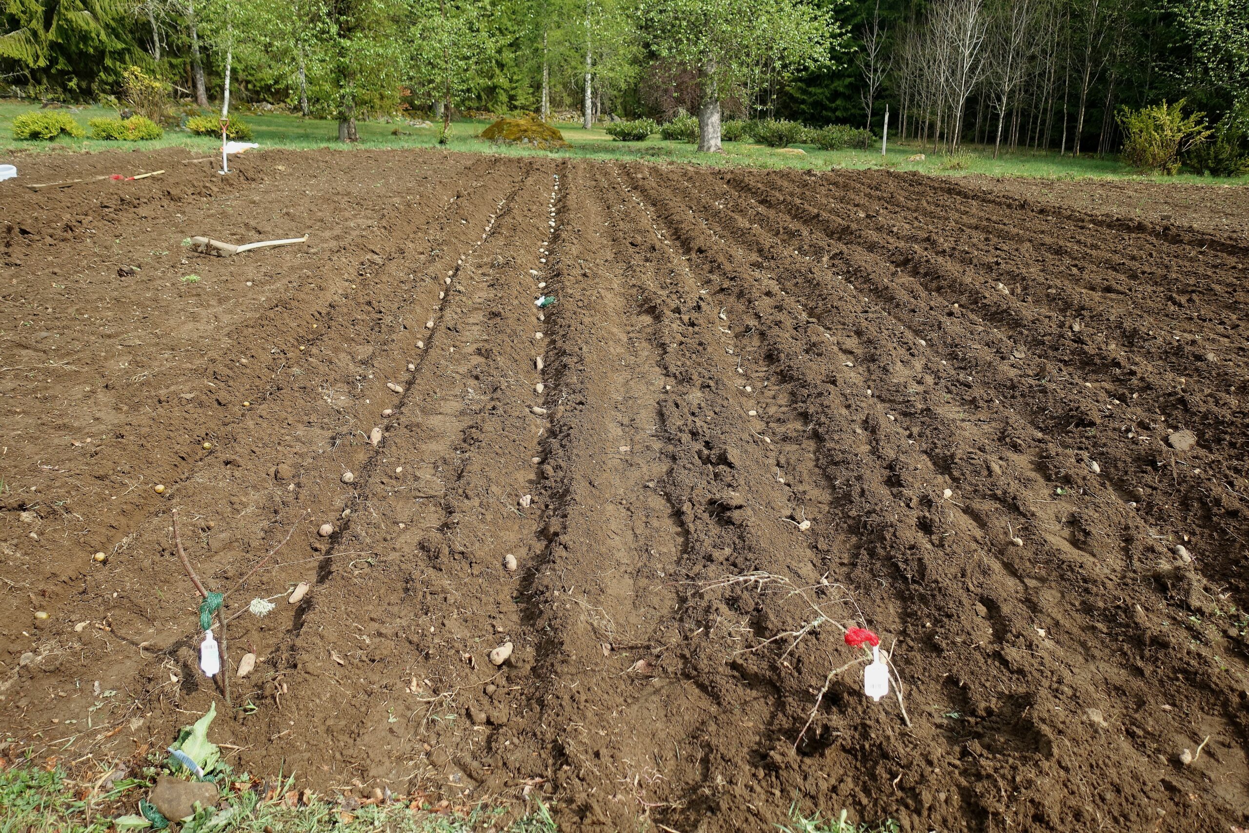 Vi har fått hjälp av traktor att dra upp fåror till potatisen, som lags i jorden för hand.
