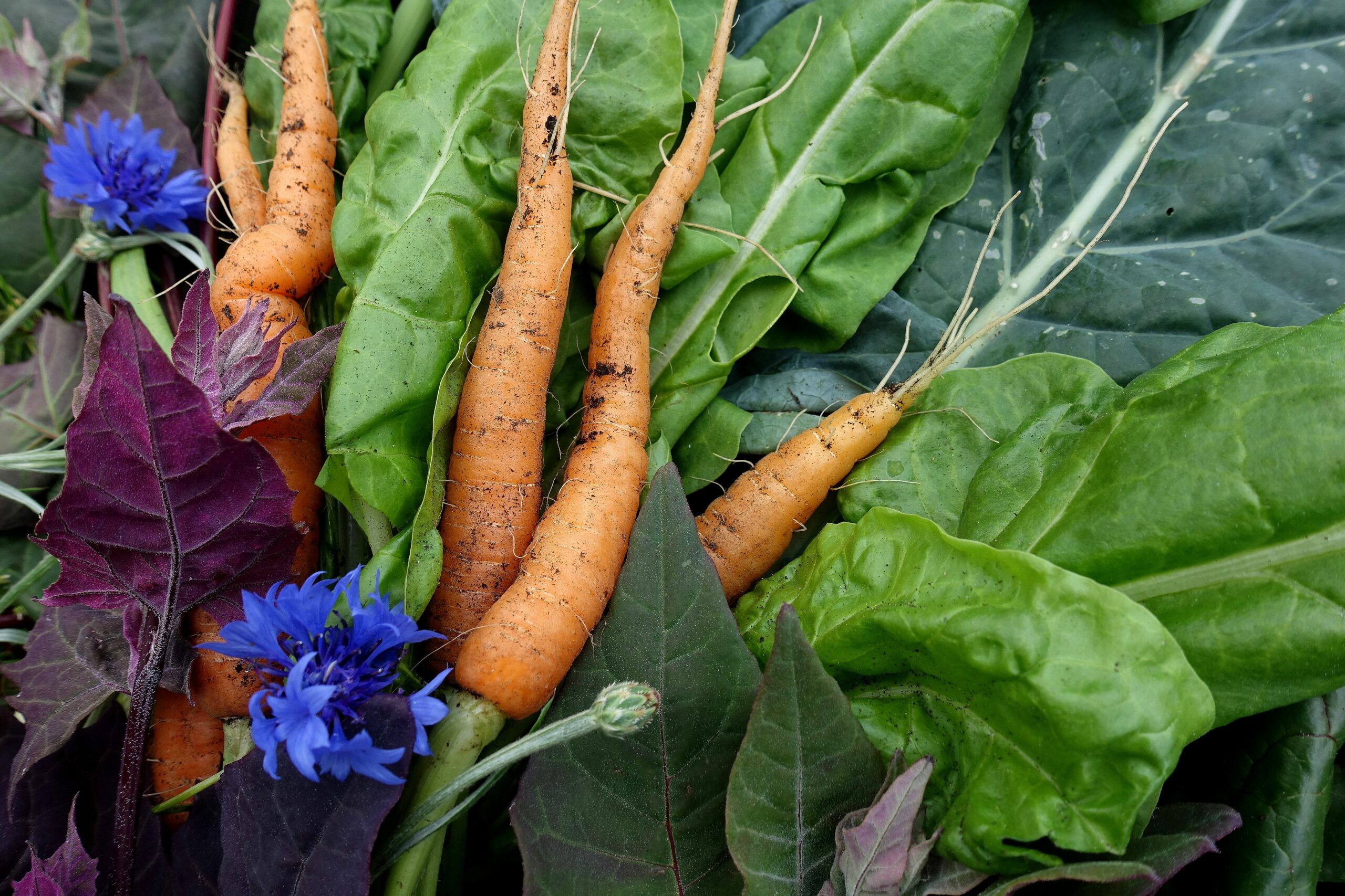 Så här vackra färger kan skörden innehålla på senvåren. Målla, blåklint, morot, mangold och svartkål lyser ikapp med sina fina färger.