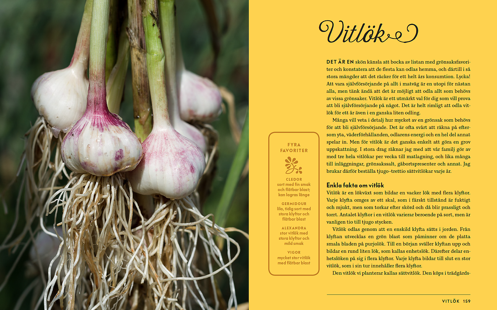 Boken består av femton porträtt av bra grönsaker i en köksträdgård. Här är inledningen på kapitlet om vitlök.