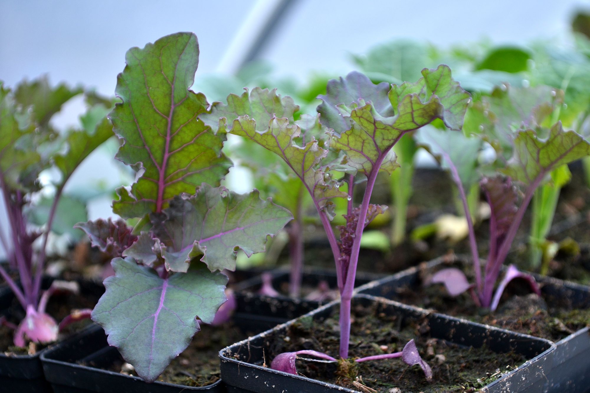 Här har kålplantorna planterats om till mindre krukor och ska snart sättas ut på växtplatsen. Kålen står här i tunnelväxthuset på stora brickor där de kan lapa vatten och inte behöver riskera att torka ut.