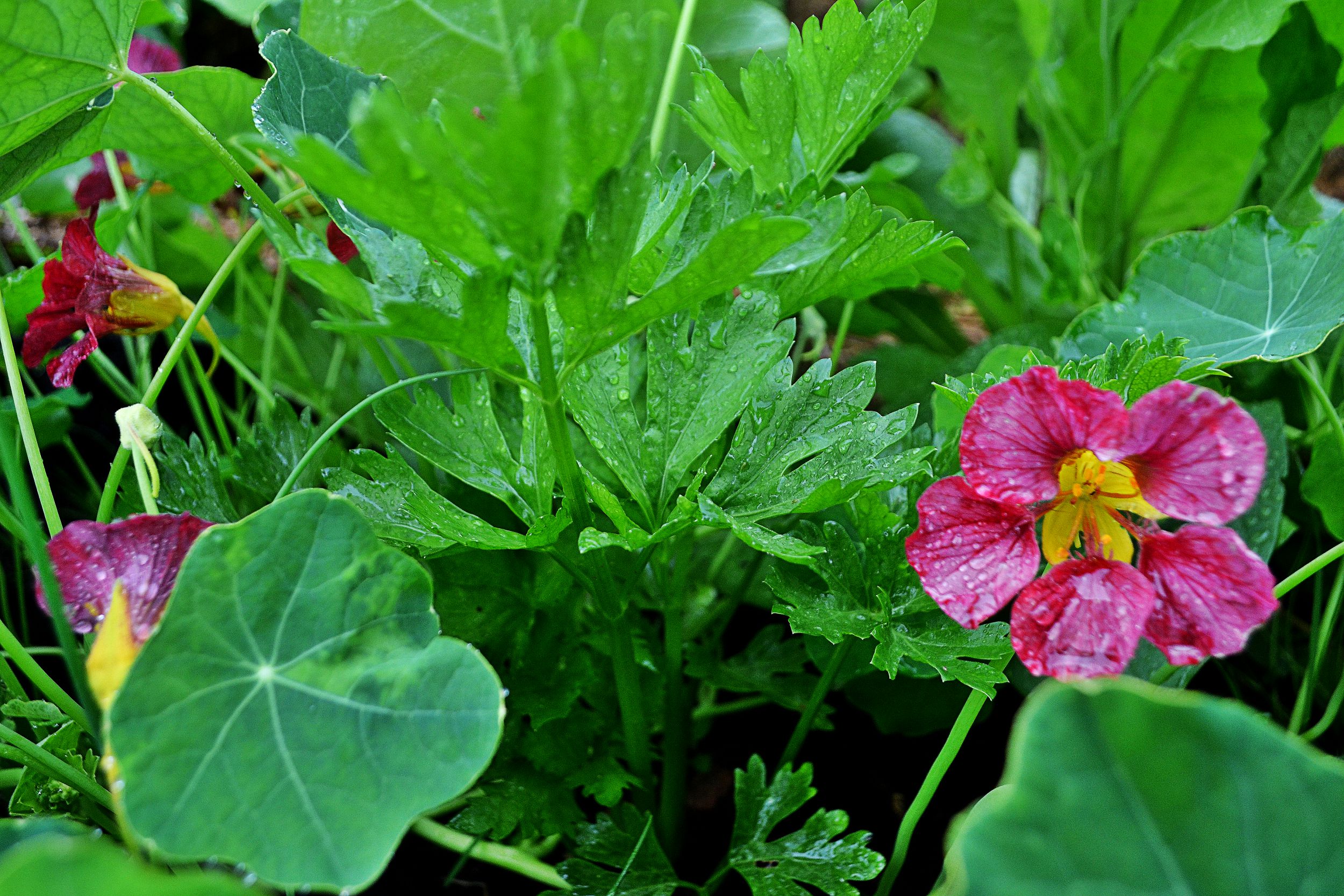 De än så länge ganska små krasseplantorna vällde senare ut över planteringen och gav sellerin ganska lite utrymme. Krassen heter 'Purple Emperor'.