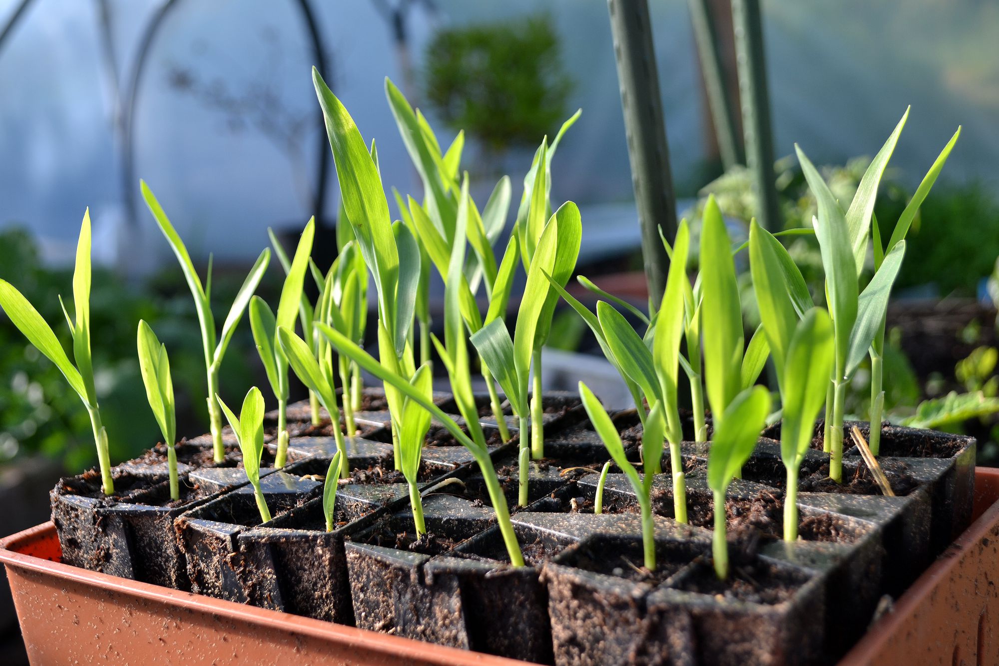 Ett helt tråg rymmer 40 plantor majs. Mycket på liten yta.