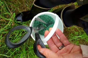 Ferramol är ett pellets som strös ut på marken. Här klipper jag sniglar och doppar saxen i pellets mellan varje snigel, för att sprida kornen på de döda sniglarna.