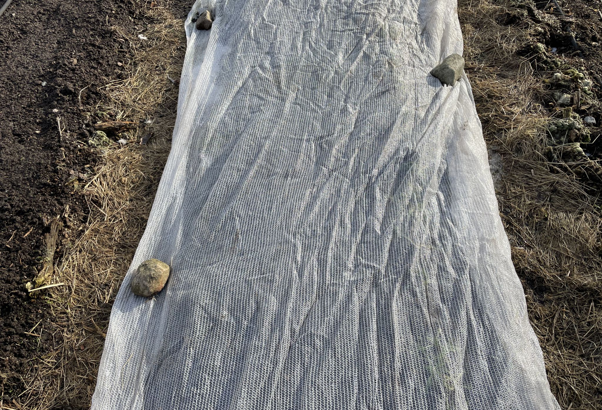Specialfiberduken hålls på plats med stenar längs kanterna. Den släpper igenom vatten, men ger också extra värme under duken.