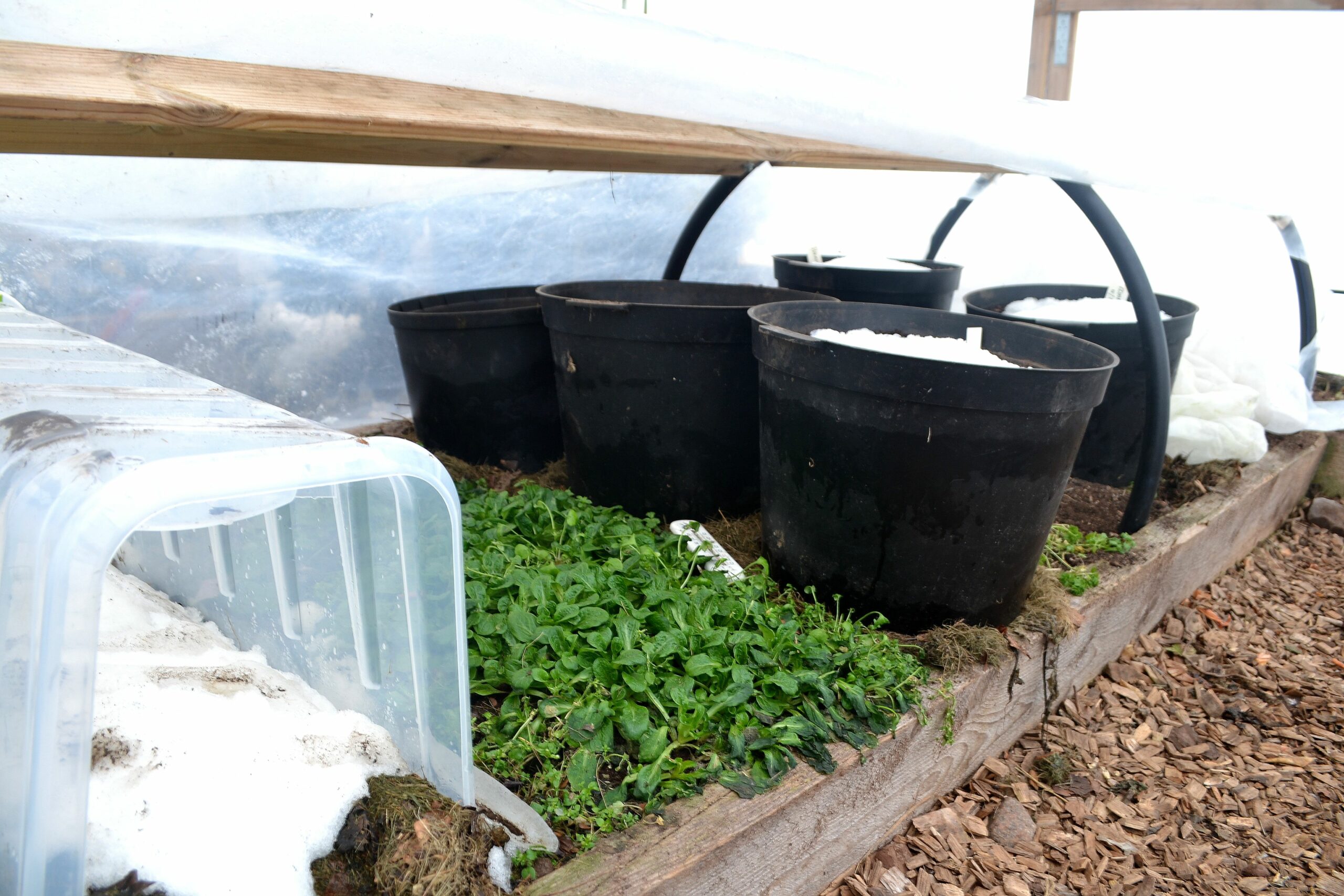 Så här såg det ut förra året när jag just sått sockerärter i tunnelväxthuset i slutet av januari. Ärterna är sådda i minitunneln till vänster och har fått både lätt täcke av gräsklipp och därtill ett lager snö på toppen.